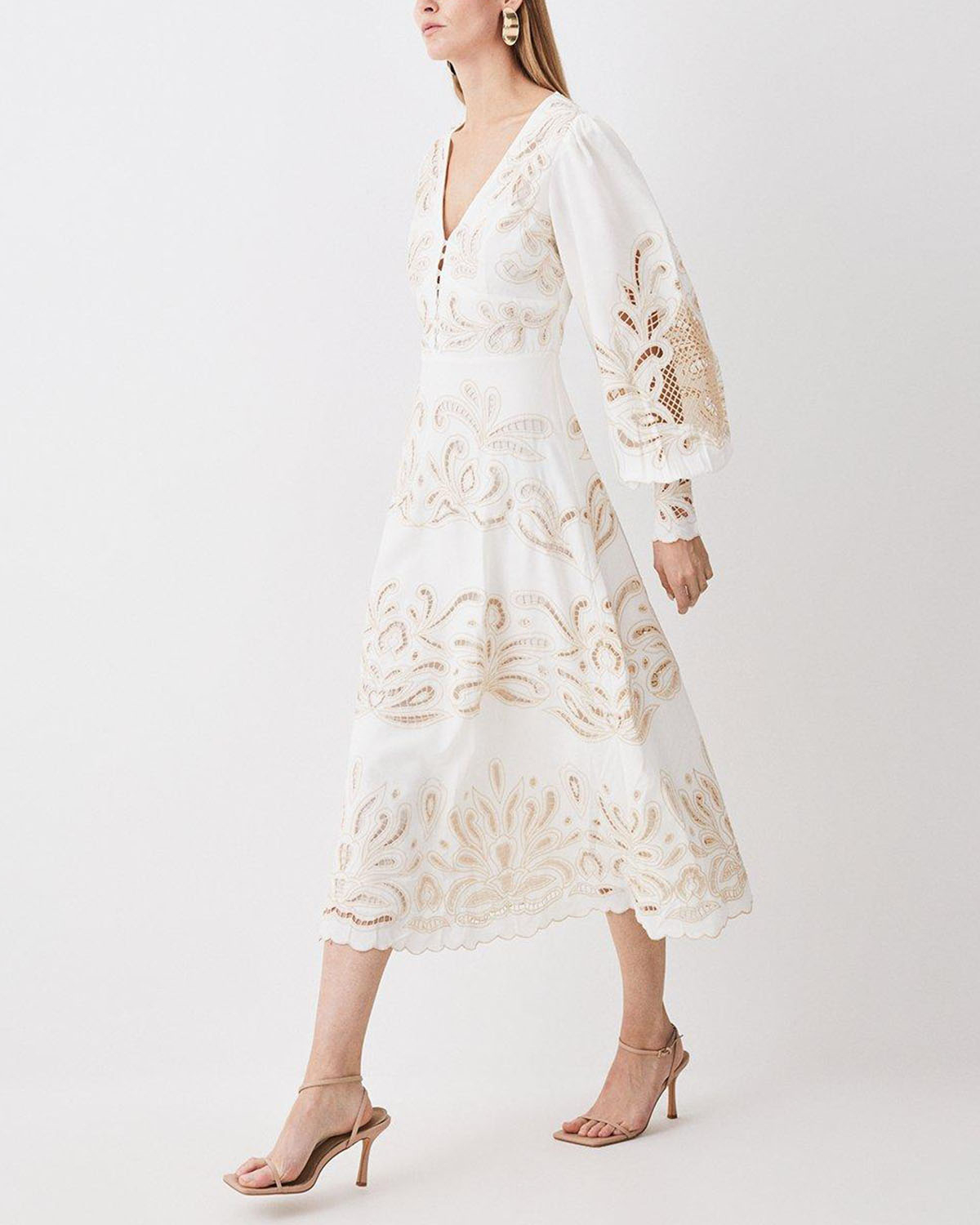 Mirrored Cutwork Tie Front Woven Midi Dress