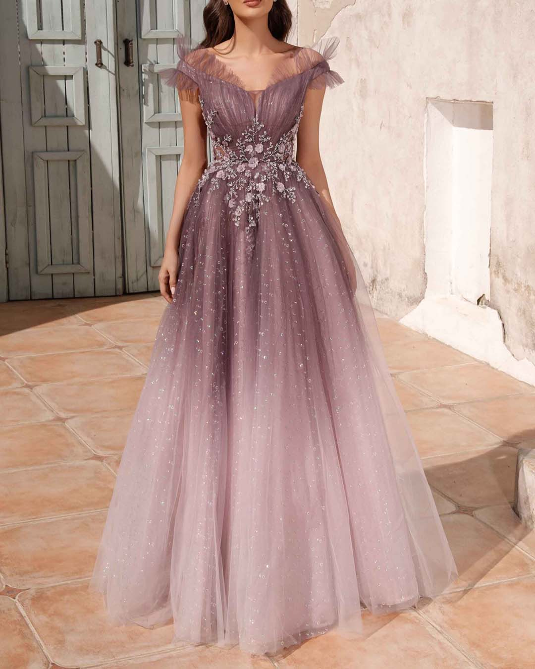 Sequined Floral Beaded Ombre Tulle Dress Gown