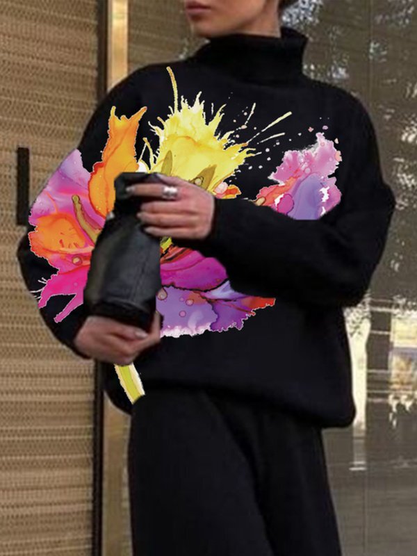 Flower Print Split-Joint Long Sleeves Loose High Neck Sweatshirt Tops