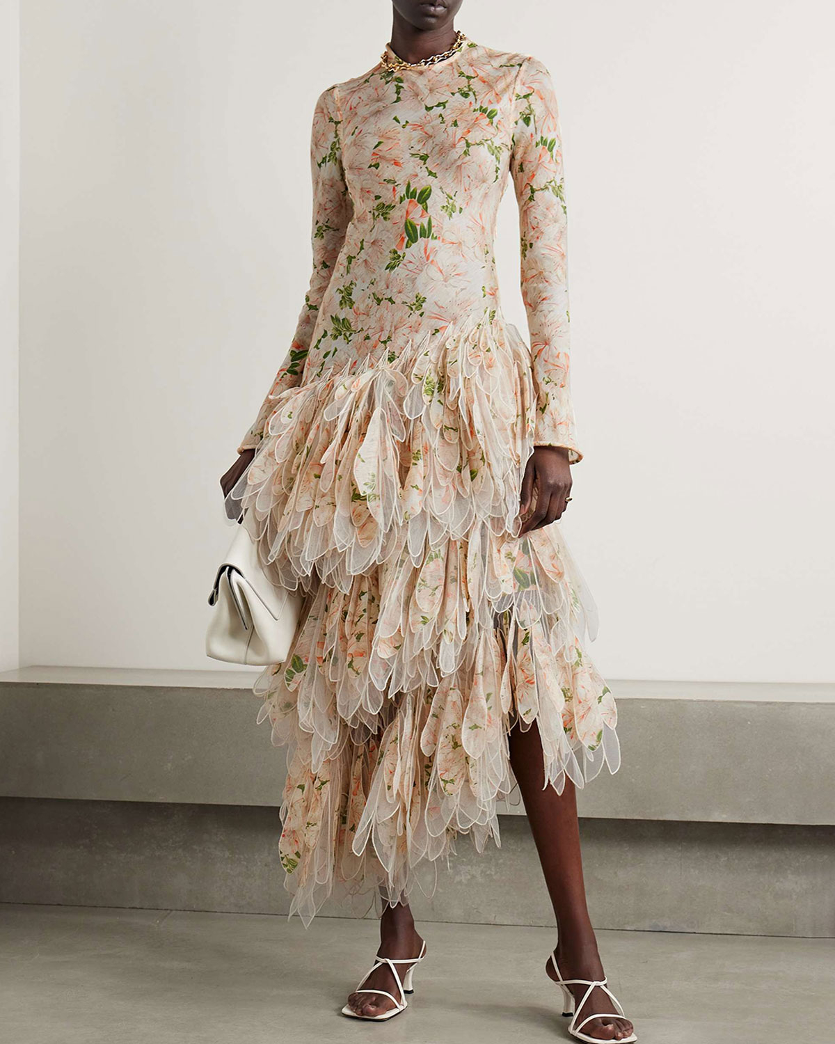 Asymmetric tulle-trimmed floral-print linen and silk-blend maxi dress