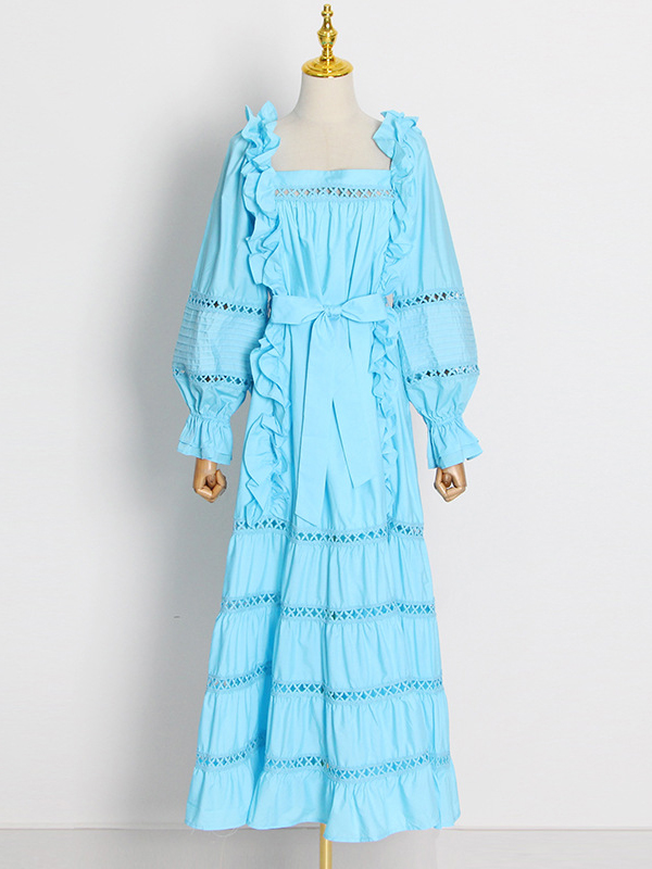 Bohemia Long Sleeves Loose Solid Color U-Neck Maxi Dress