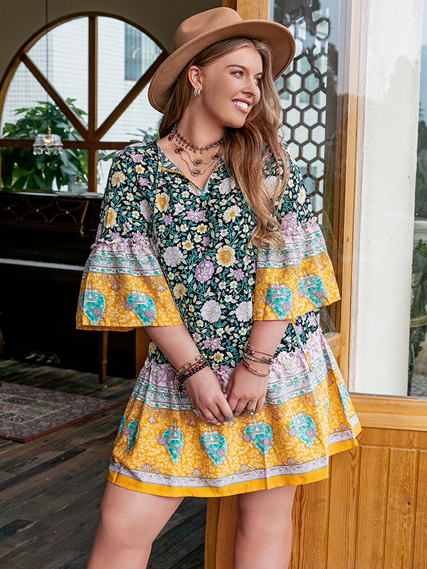 Bohemia Loose Flared Sleeves Floral Printed V-Neck Mini Dresses