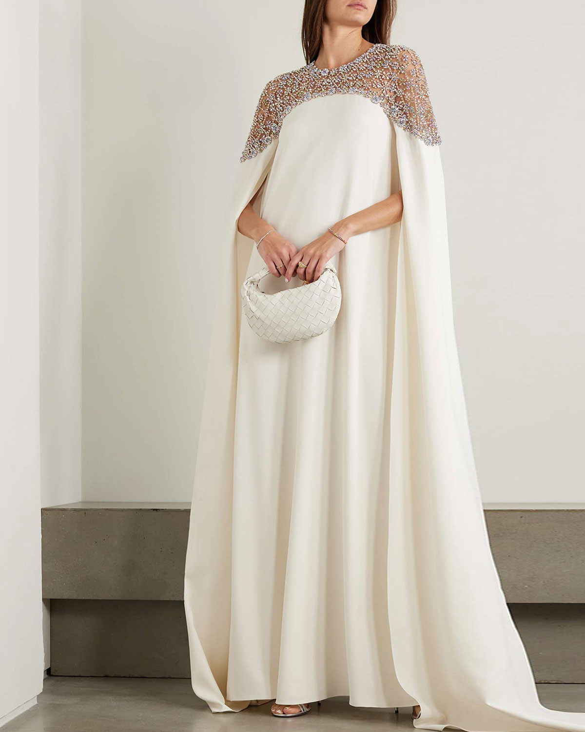 Cape-Effect Embellished Tulle-Trimmed Stretch-Silk Crepe Gown