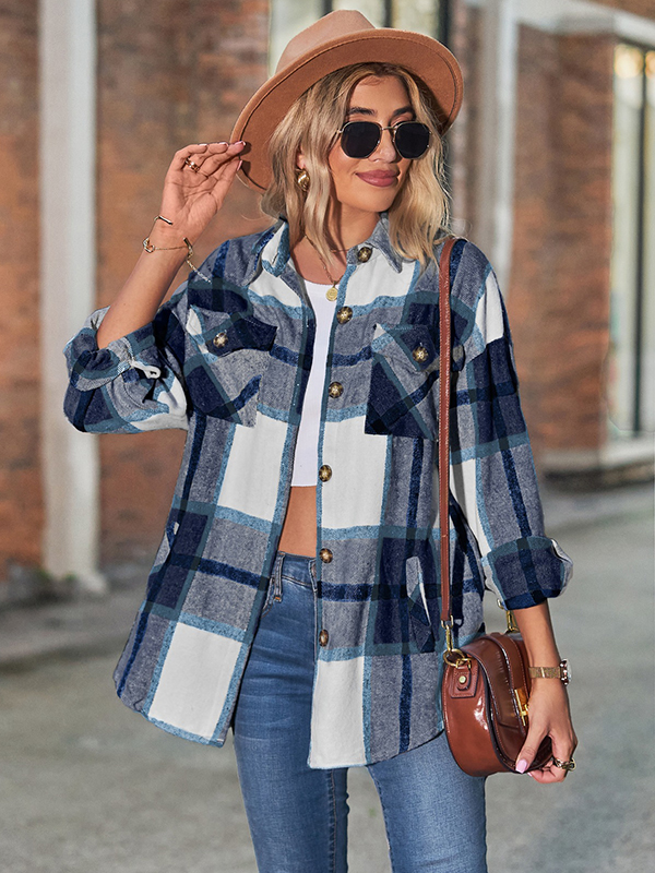 Casual Loose Buckle Plaid Polo Shirt Top