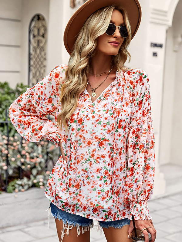 Casual Loose Floral Printed V-Neck T-Shirt