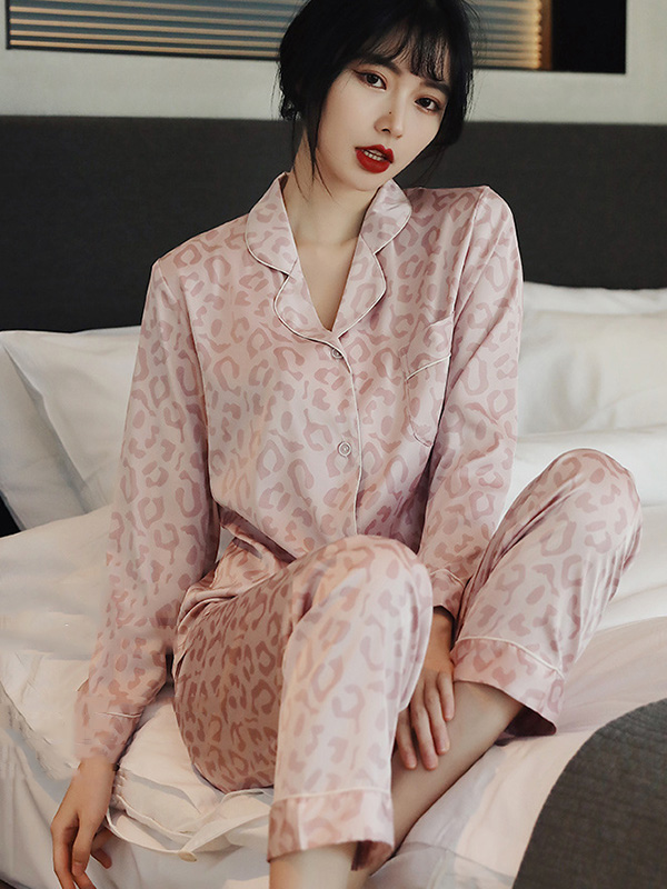 Comfortable Lapel Leopard T-Shirt&Pants Pajama Set