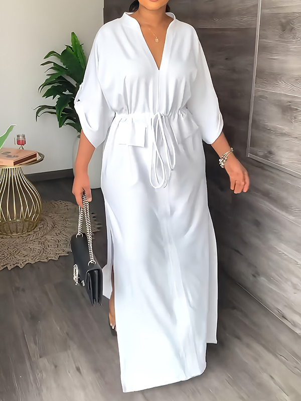 Loose Drawstring Solid Color Split-Side V-Neck Maxi Dresses