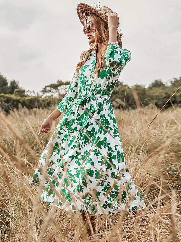 Fashion Ladies Long Skirt Green Print Lace-Up Dress