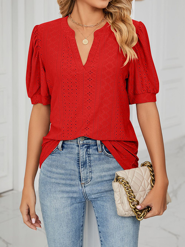 Hollow Solid Color Bishop Sleeve Loose V-neck T-Shirts Tops