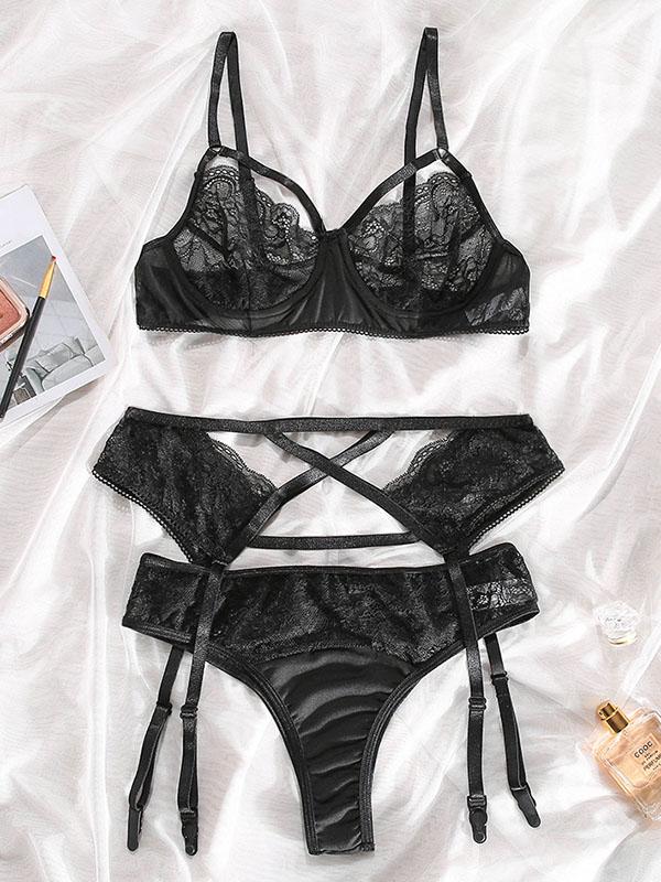 Lace Bandage Underwiredthree-Piece Set Erotic Lingerie