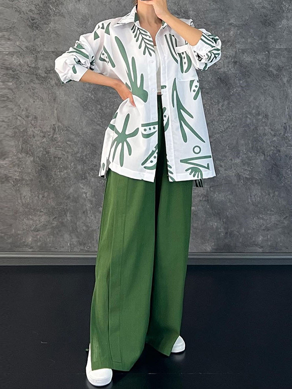 Lapel Printed High-Low Buttoned Pockets Blouse+ High Waisted Elasticity Pleated Split-Side Pants Two Pieces Set