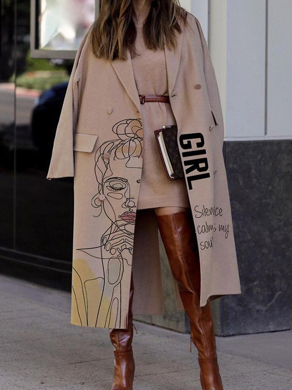 Loose Abstract Printed Lapel Collar Buttoned Long Sleeve Long Outerwear