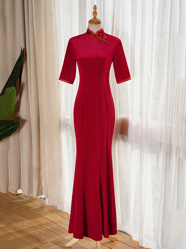 Original Applique Pleuche Stand Collar Half Sleeves Long Cheongsams