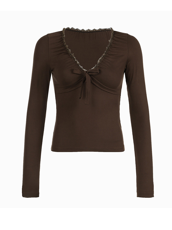 Pleated Tie Long Sleeve T-Shirt In Brown