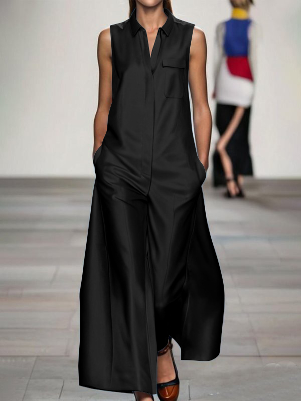 Loose Sleeveless Pockets Solid Color Lapel Jumpsuits