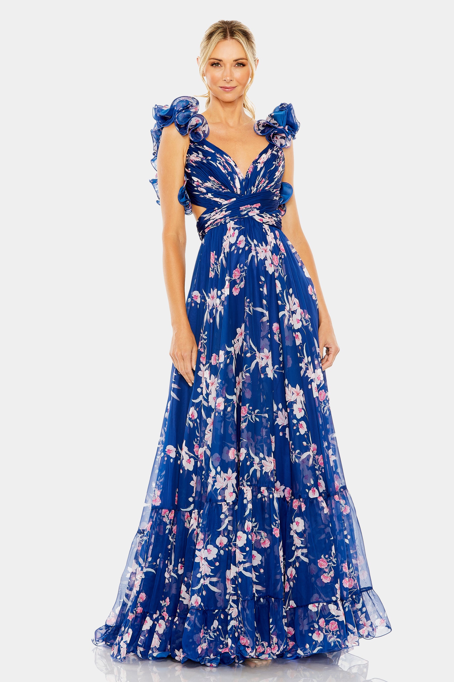 Ruffle Tiered Floral Cut-Out Chiffon Gown