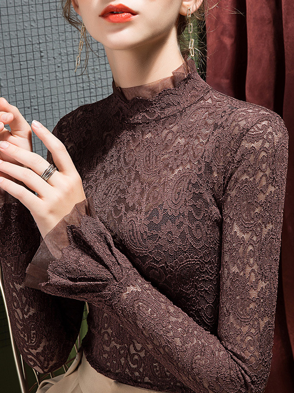 See-Through Solid Color Split-Joint Flared Sleeves Long Sleeves Mock Neck T-Shirts Tops