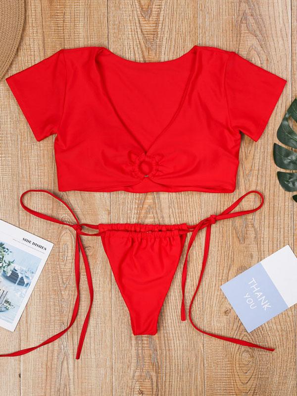 Solid Color Sexy Bandage Short Sleeve Split Tankini Swimsuit