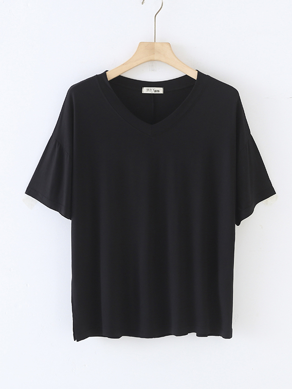 Solid Color Split-Joint Loose Short Sleeves V-neck T-Shirts Tops