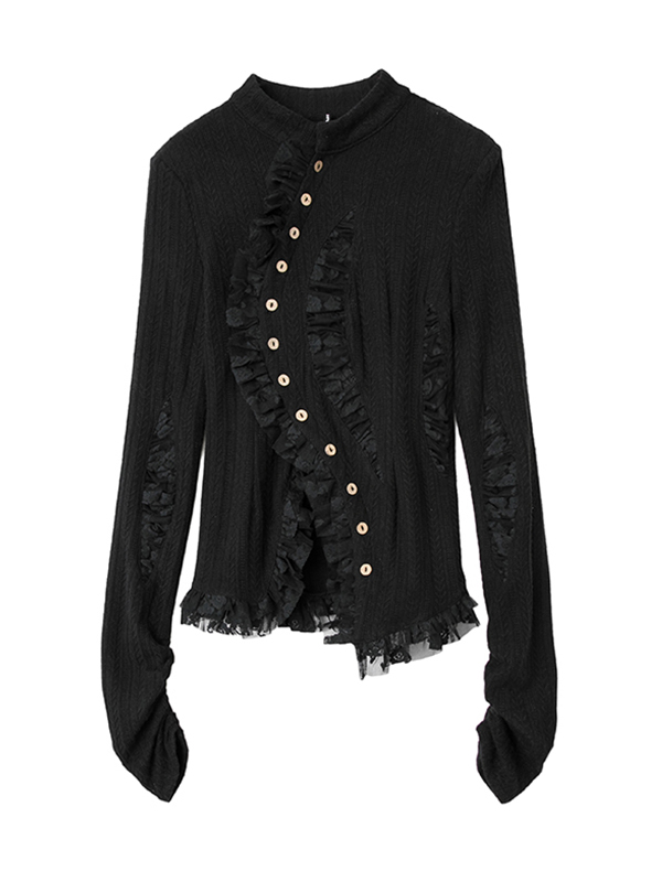Stylish Asymmetric Buttoned Hollow Lace Stand Collar Long Sleeves Knitwear Cardigan