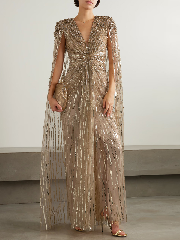 V-Neck Sequin Solid Color Maxi Dress