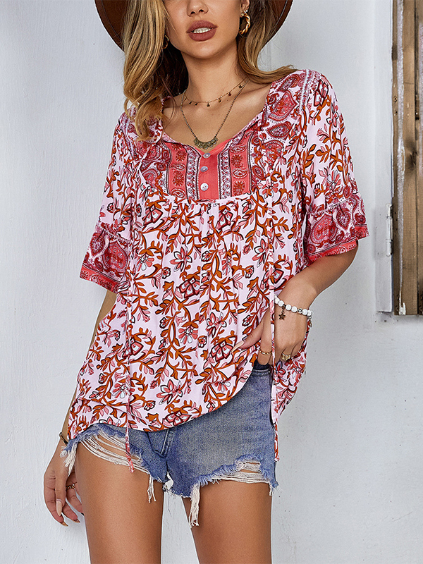 Vacation Half Sleeves Loose Floral Printed V-Neck T-Shirt Top