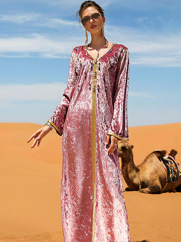 Vacation Long Sleeves Loose Lace-Up Embroidered V-Neck Dress